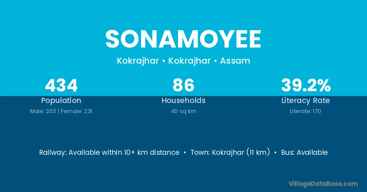 Kokrajhar (11 km) is the nearest town to Sonamoyee village for major economic activities and is located approximately 11 km away.