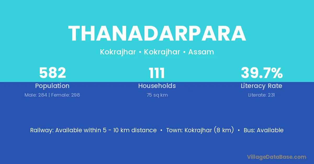 Kokrajhar (8 km) is the nearest town to Thanadarpara village for major economic activities and is located approximately 8 km away.
