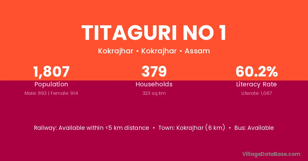 Kokrajhar (6 km) is the nearest town to Titaguri No 1 village for major economic activities and is located approximately 6 km away.