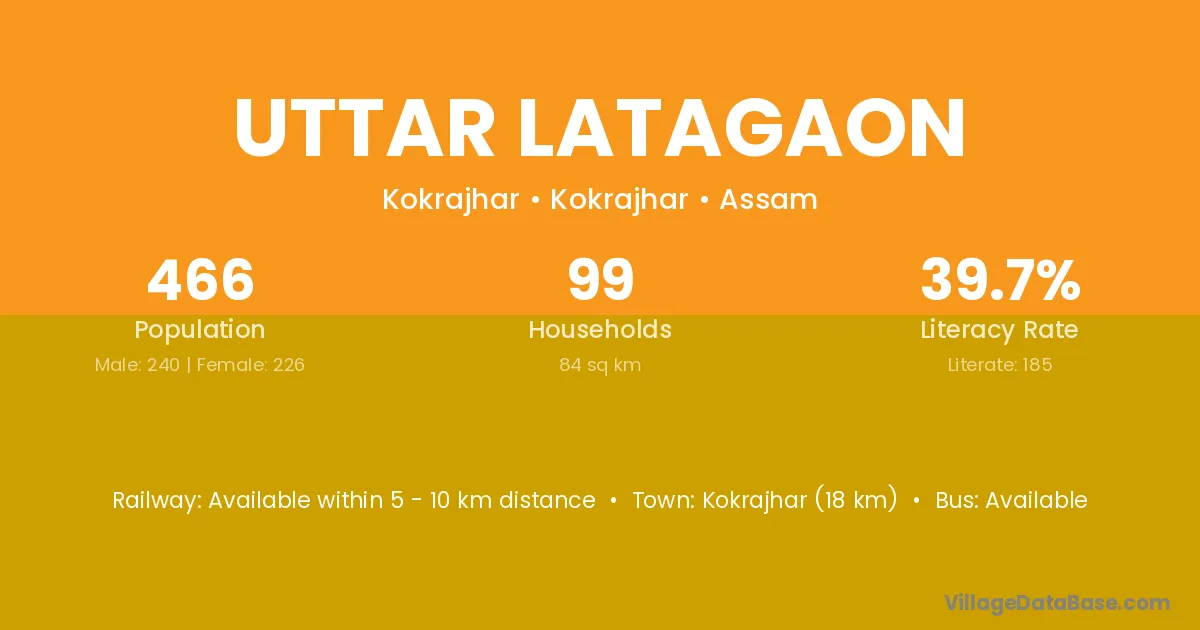 Kokrajhar (18 km) is the nearest town to Uttar Latagaon village for major economic activities and is located approximately 18 km away.