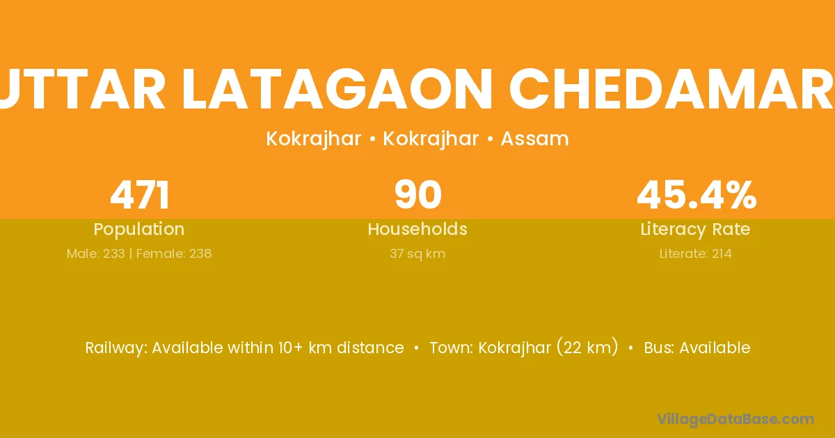 Kokrajhar (22 km) is the nearest town to Uttar Latagaon Chedamari village for major economic activities and is located approximately 22 km away.
