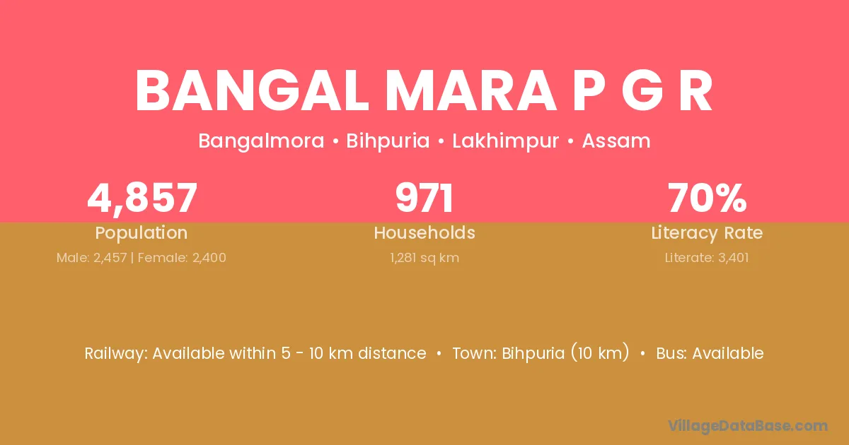 Bihpuria (10 km) is the nearest town to Bangal Mara P G R village for major economic activities and is located approximately 10 km away.