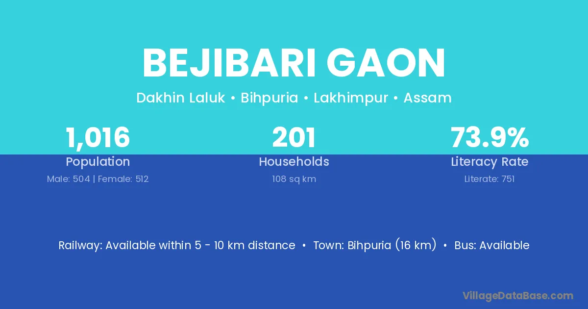 Bejibari Gaon village has a total population of 1,016 people, of which 504 are males and 512 are females.