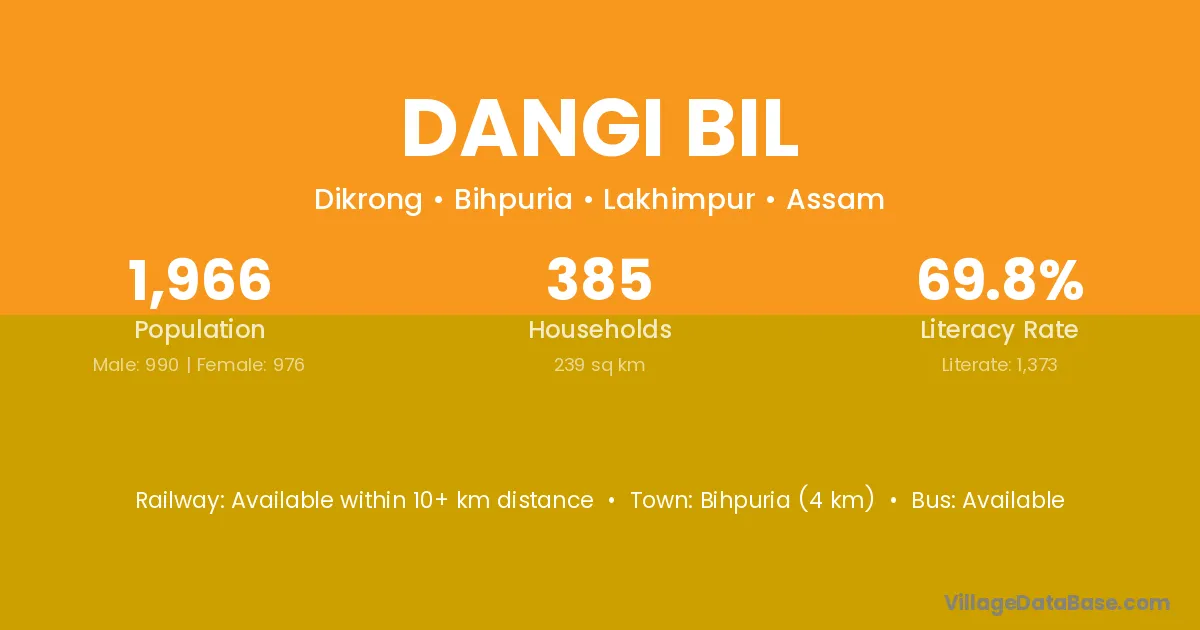 Bihpuria (4 km) is the nearest town to Dangi Bil village for major economic activities and is located approximately 4 km away.