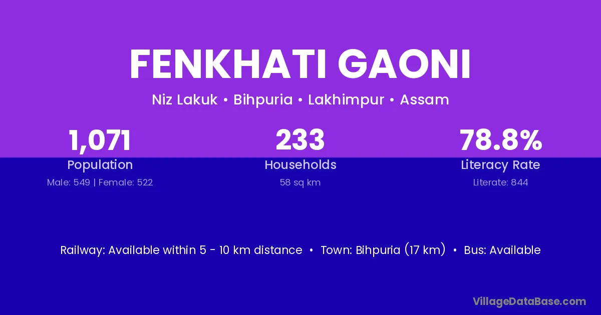 Fenkhati Gaoni village has a total population of 1,071 people, of which 549 are males and 522 are females.