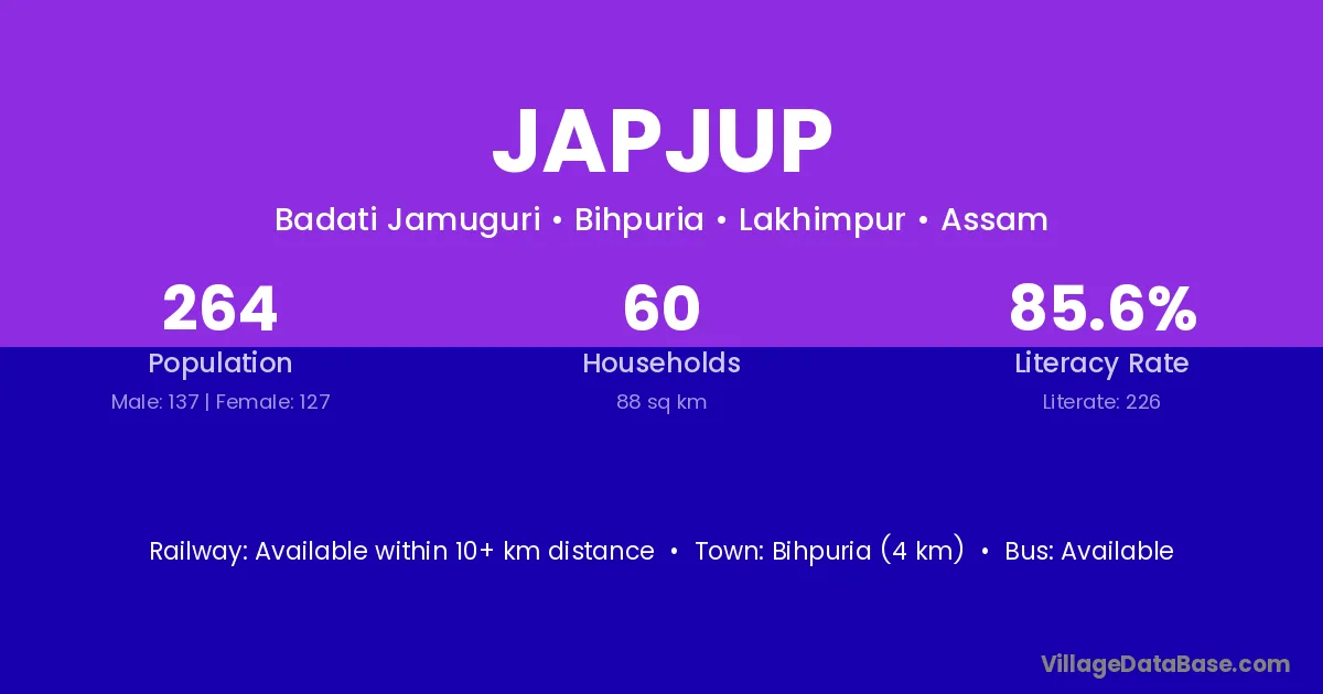 Bihpuria (4 km) is the nearest town to Japjup village for major economic activities and is located approximately 4 km away.