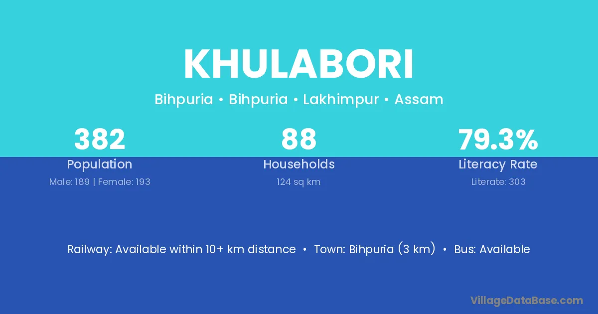 Bihpuria (3 km) is the nearest town to Khulabori village for major economic activities and is located approximately 3 km away.