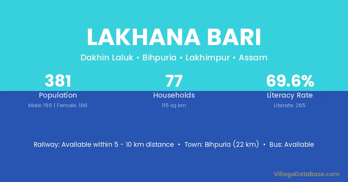 Bihpuria (22 km) is the nearest town to Lakhana Bari village for major economic activities and is located approximately 22 km away.