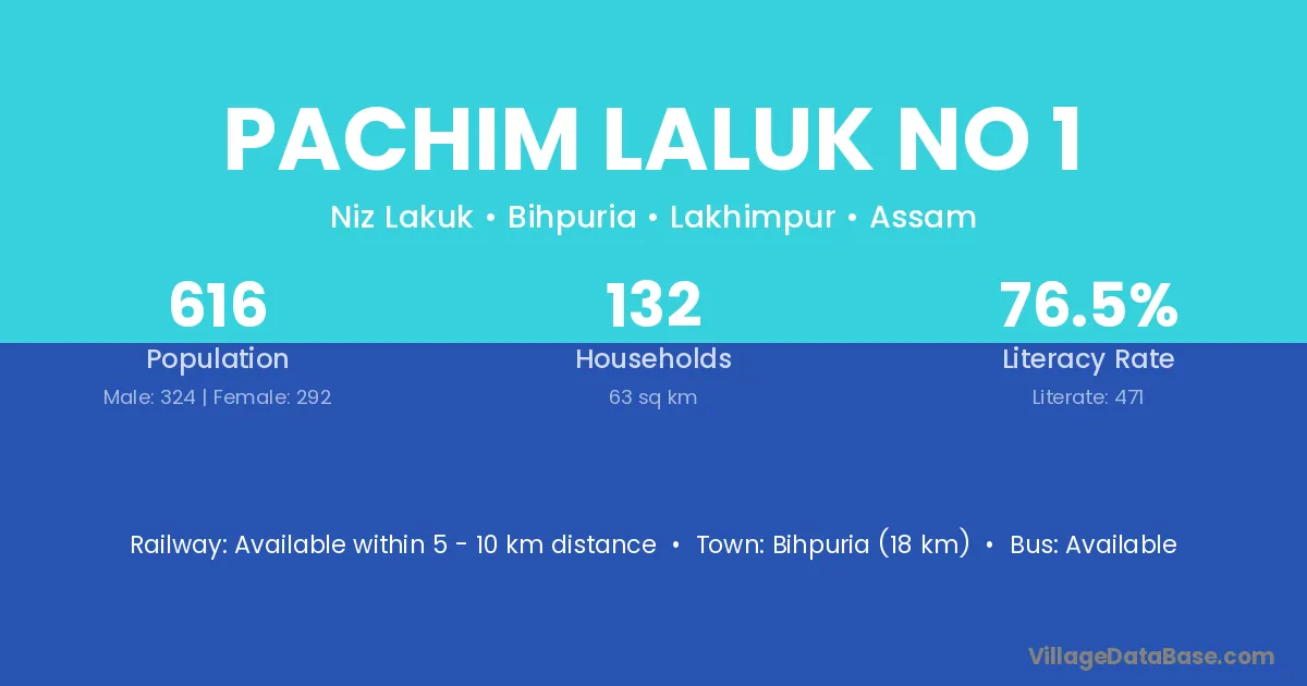 Bihpuria (18 km) is the nearest town to Pachim Laluk No 1 village for major economic activities and is located approximately 18 km away.