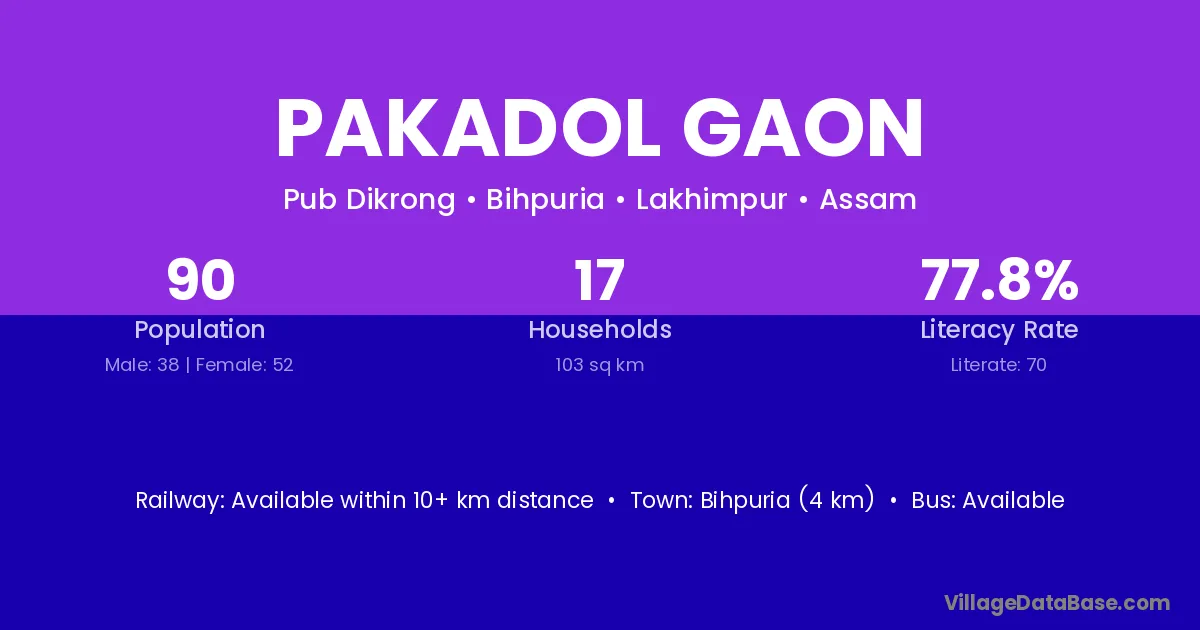 Bihpuria (4 km) is the nearest town to Pakadol Gaon village for major economic activities and is located approximately 4 km away.