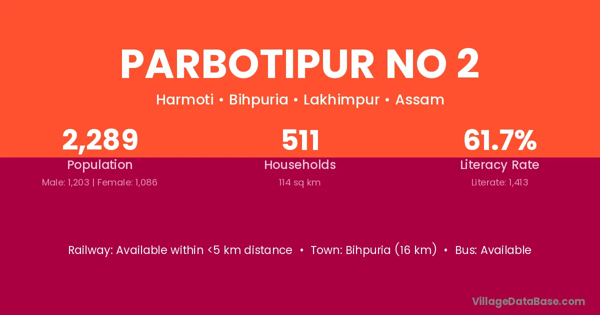 Bihpuria (16 km) is the nearest town to Parbotipur No 2 village for major economic activities and is located approximately 16 km away.