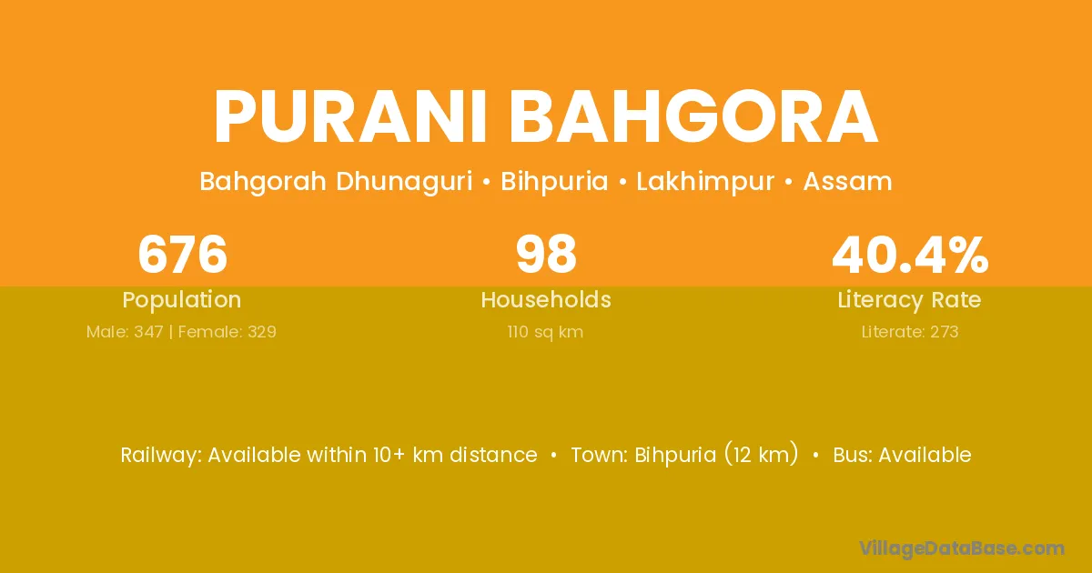 Bihpuria (12 km) is the nearest town to Purani Bahgora village for major economic activities and is located approximately 12 km away.