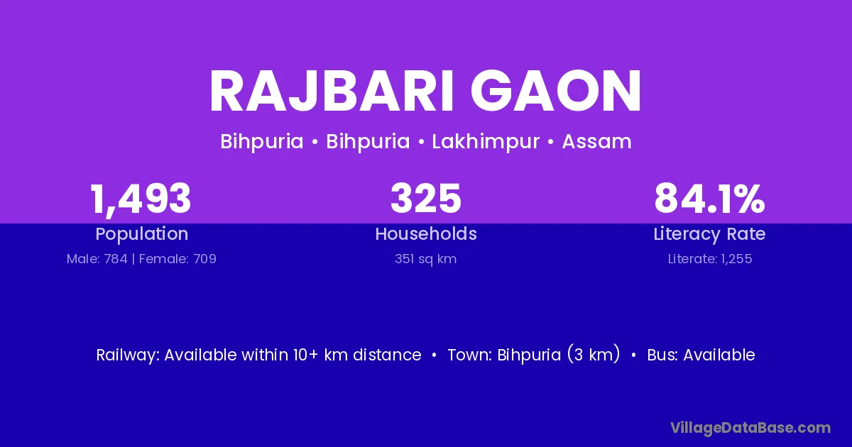 Rajbari Gaon village has a total population of 1,493 people, of which 784 are males and 709 are females.