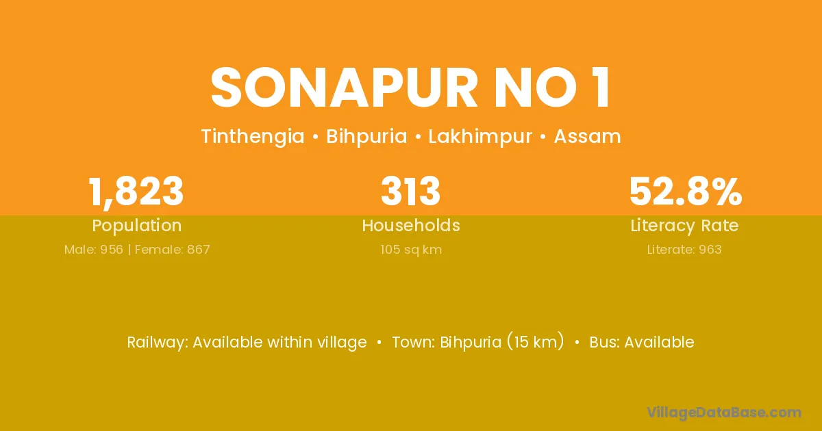 Bihpuria (15 km) is the nearest town to Sonapur No 1 village for major economic activities and is located approximately 15 km away.