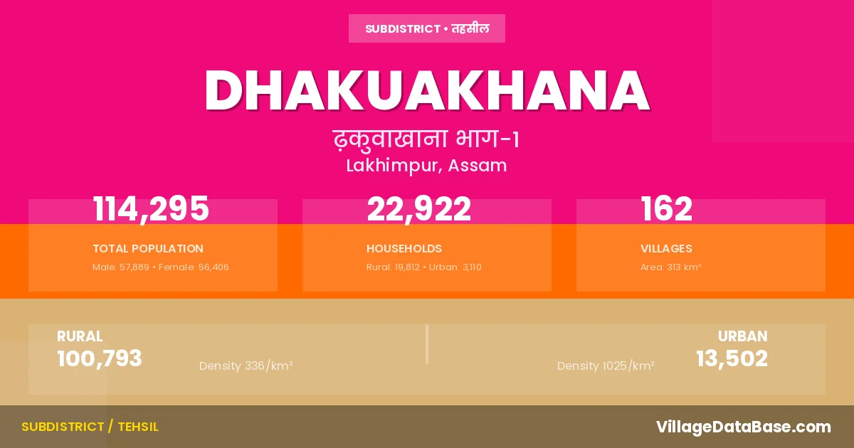 According to the 2011 census The total area of Dhakuakhana Subdivision is 313 km², with a population of 114295 people. The population density is 365 inhabitants per square kilometre, and there are approximately 22922 houses in the sub district.