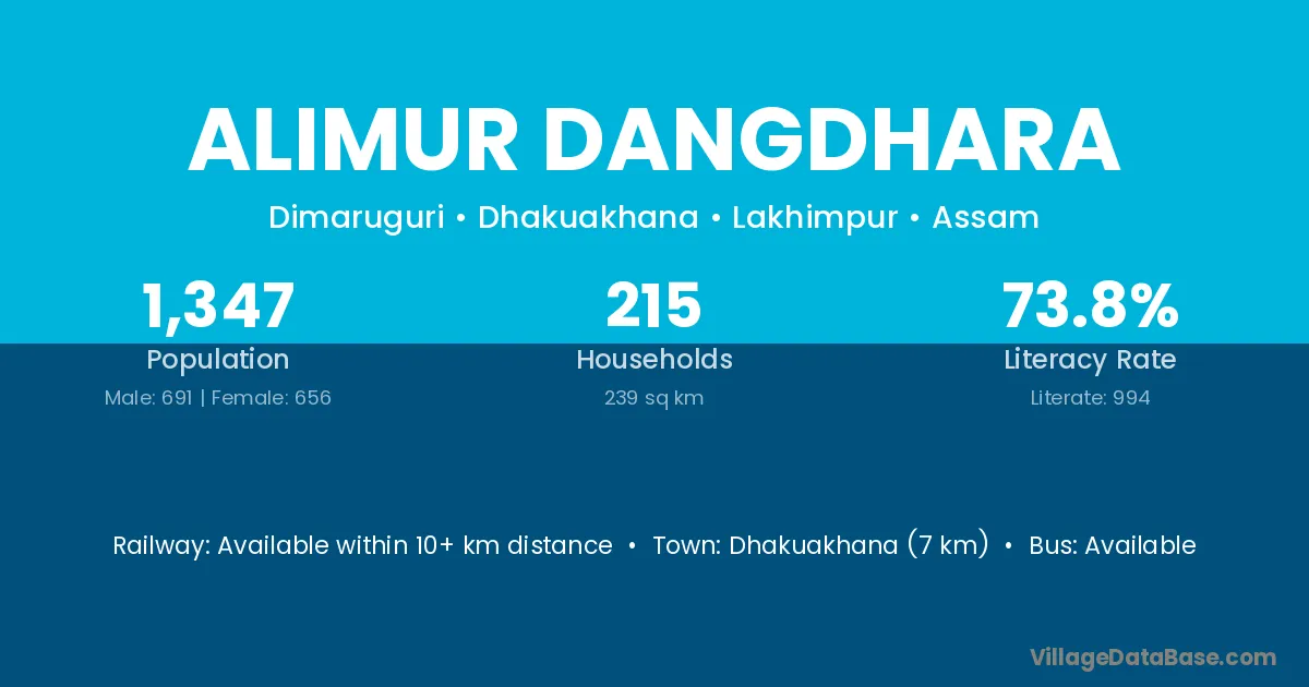 Dhakuakhana (7 km) is the nearest town to Alimur Dangdhara village for major economic activities and is located approximately 7 km away.