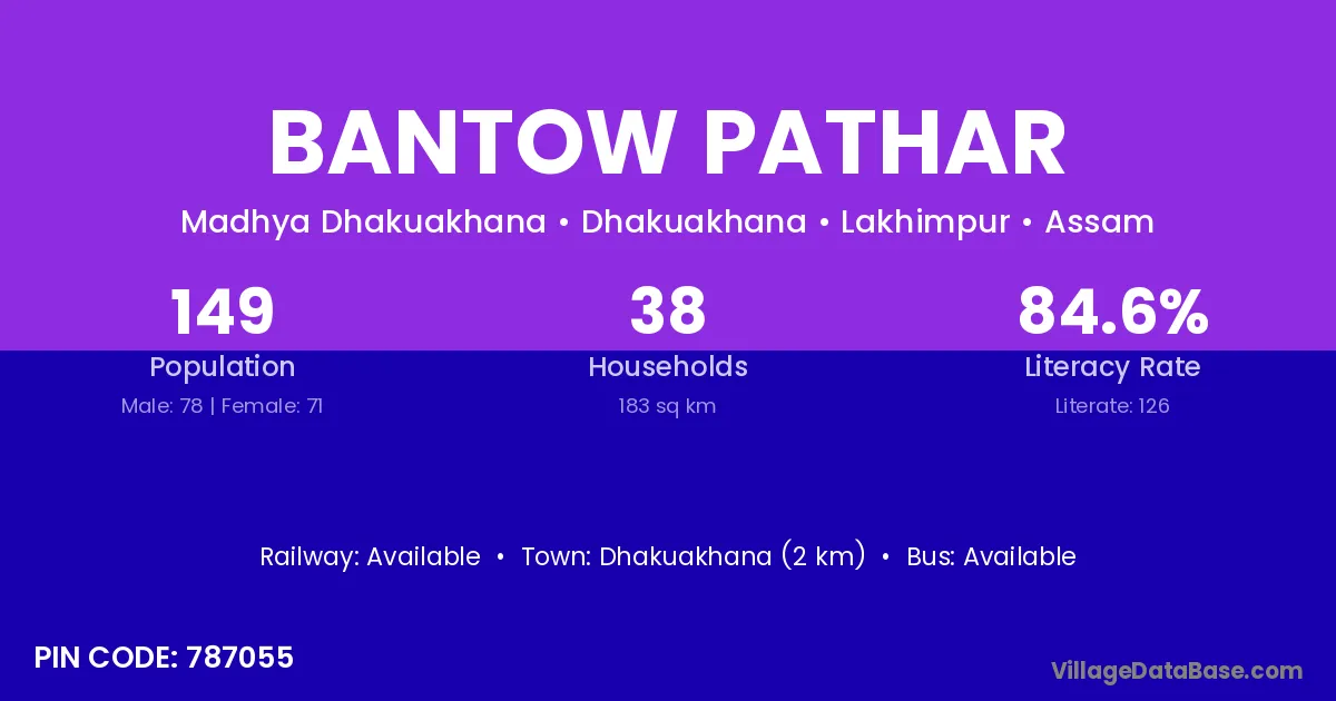 Dhakuakhana (2 km) is the nearest town to Bantow Pathar village for major economic activities and is located approximately 2 km away.