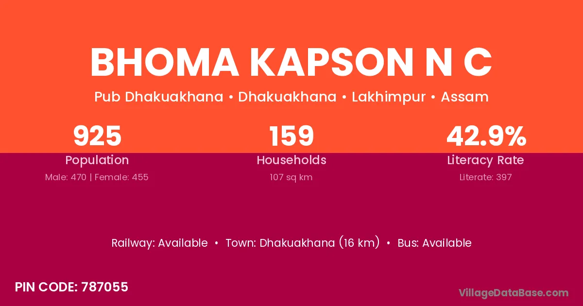 Dhakuakhana (16 km) is the nearest town to Bhoma Kapson N C village for major economic activities and is located approximately 16 km away.