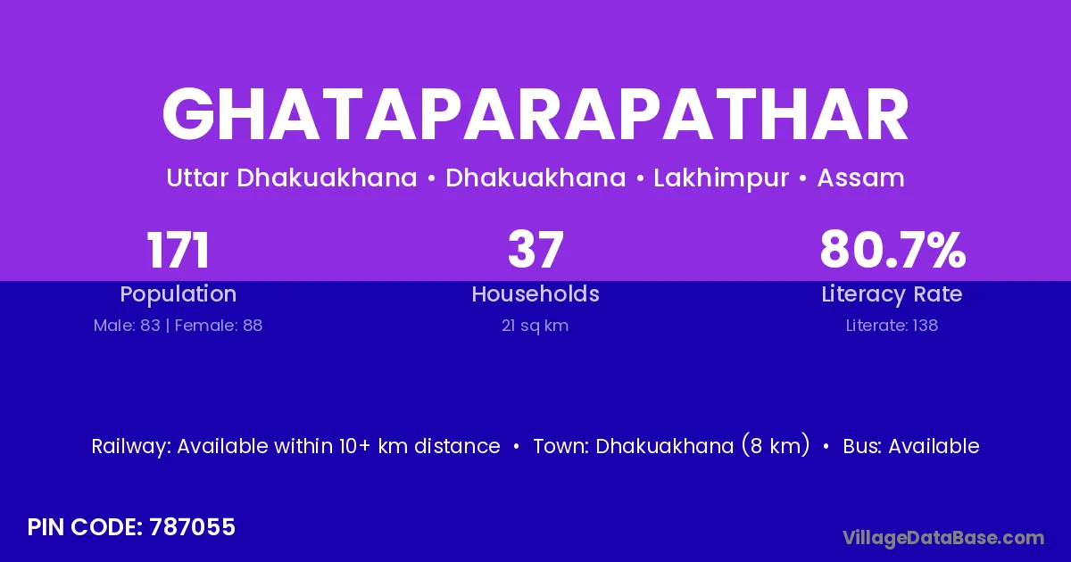 Dhakuakhana (8 km) is the nearest town to Ghataparapathar village for major economic activities and is located approximately 8 km away.