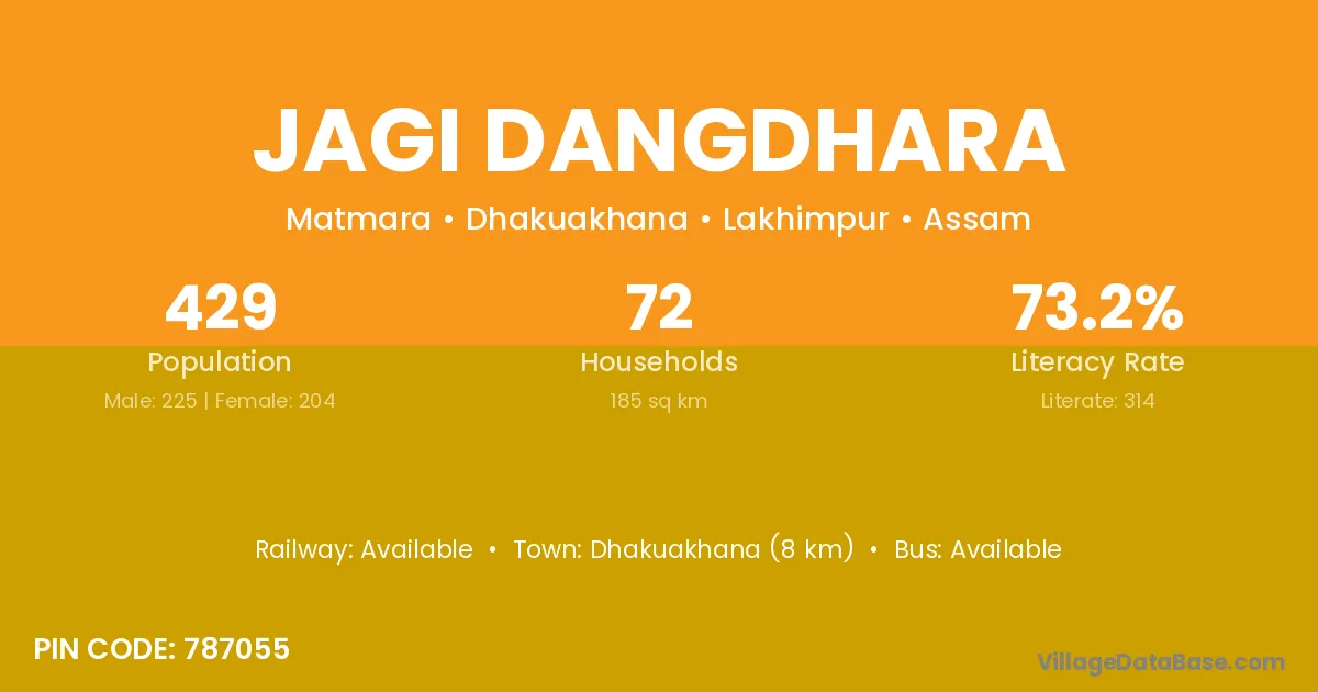 Dhakuakhana (8 km) is the nearest town to Jagi Dangdhara village for major economic activities and is located approximately 8 km away.