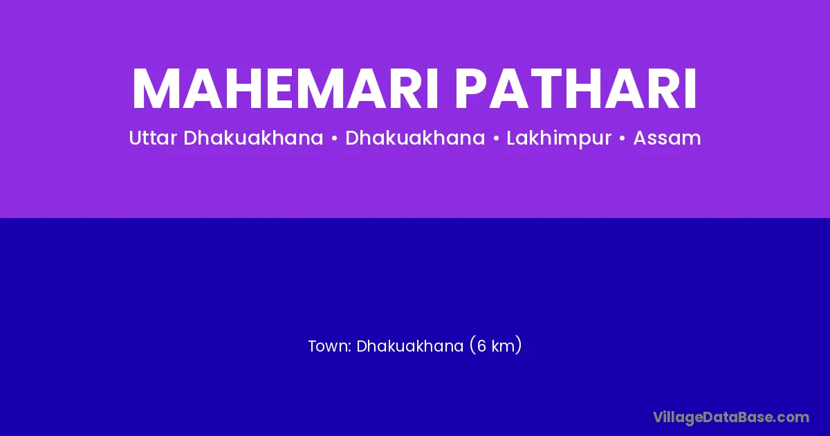 Dhakuakhana (6 km) is the nearest town to Mahemari Pathari village for major economic activities and is located approximately 6 km away.