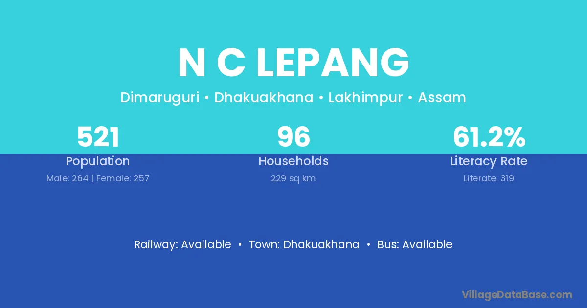 The literacy rate of N C Lepang village is 61.23%. Male literacy stands at 65.91% and female literacy at 56.42%.