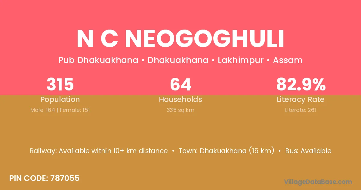 Dhakuakhana (15 km) is the nearest town to N C Neogoghuli village for major economic activities and is located approximately 15 km away.