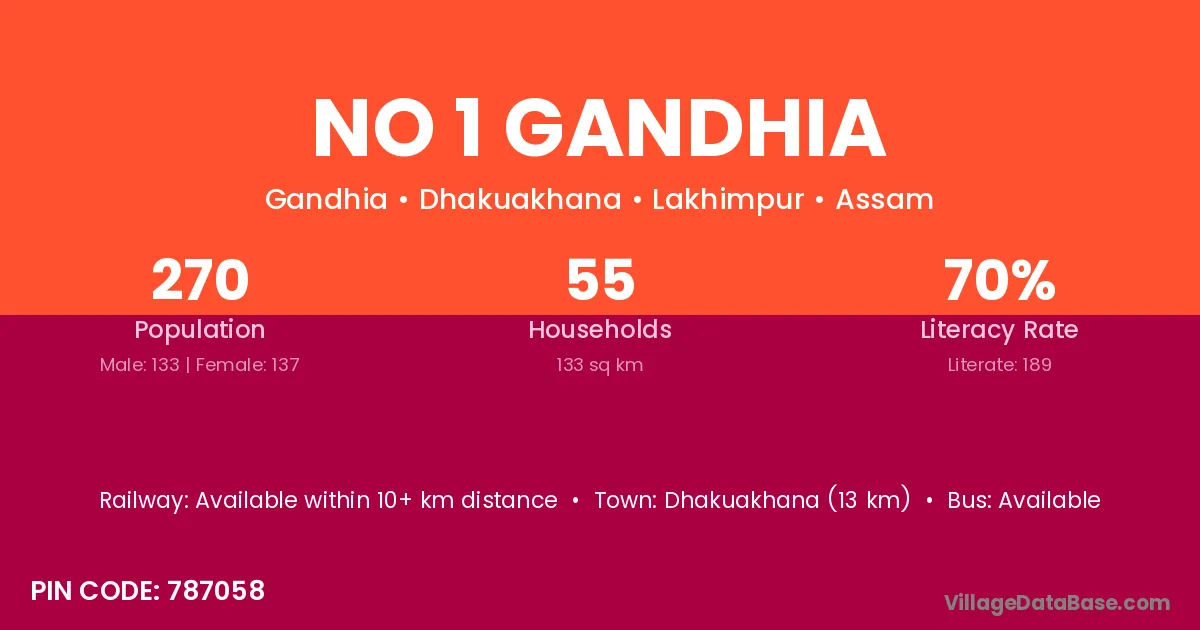 Dhakuakhana (13 km) is the nearest town to No 1 Gandhia village for major economic activities and is located approximately 13 km away.