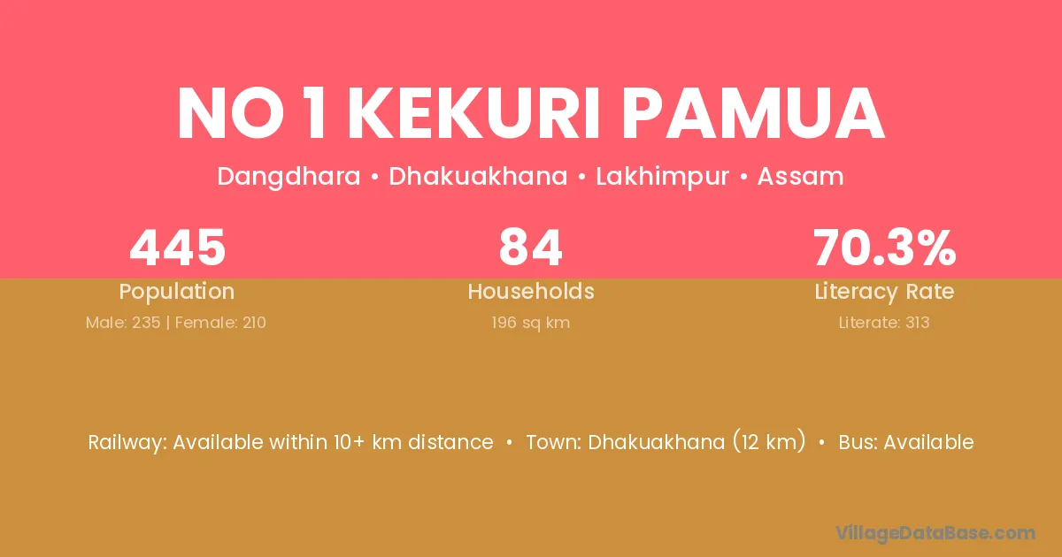 Dhakuakhana (12 km) is the nearest town to No 1 Kekuri Pamua village for major economic activities and is located approximately 12 km away.
