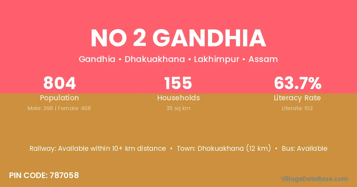 Dhakuakhana (12 km) is the nearest town to No 2 Gandhia village for major economic activities and is located approximately 12 km away.