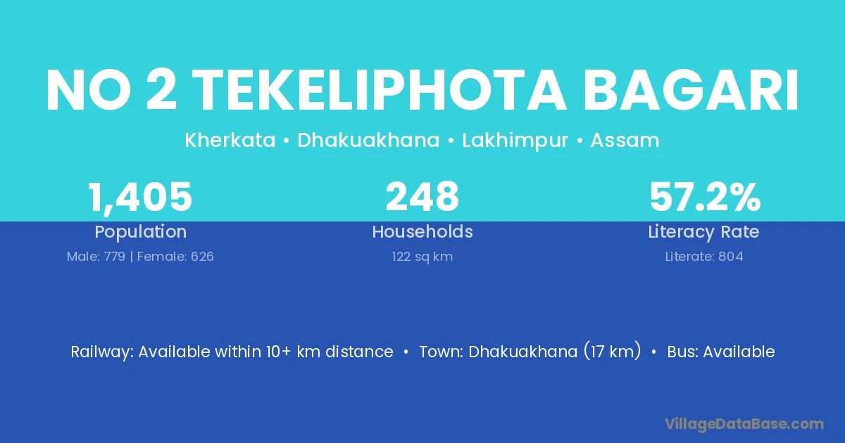 Dhakuakhana (17 km) is the nearest town to No 2 Tekeliphota Bagari village for major economic activities and is located approximately 17 km away.