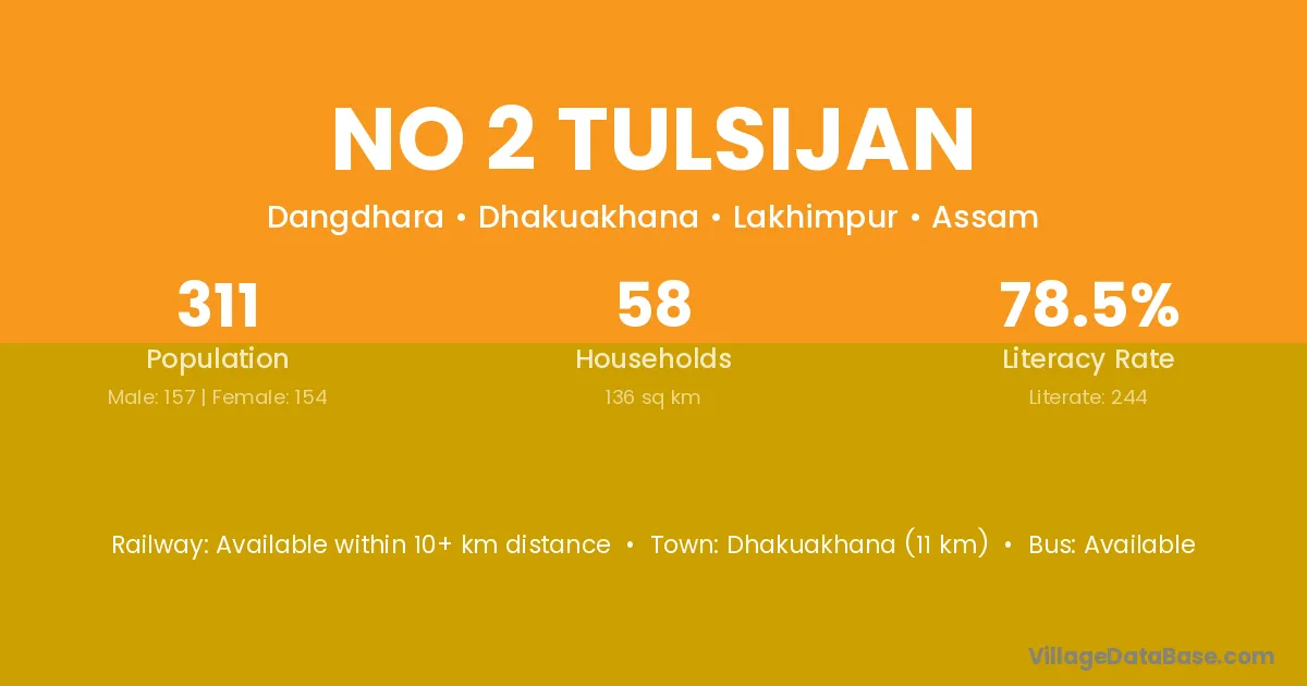 Dhakuakhana (11 km) is the nearest town to No 2 Tulsijan village for major economic activities and is located approximately 11 km away.