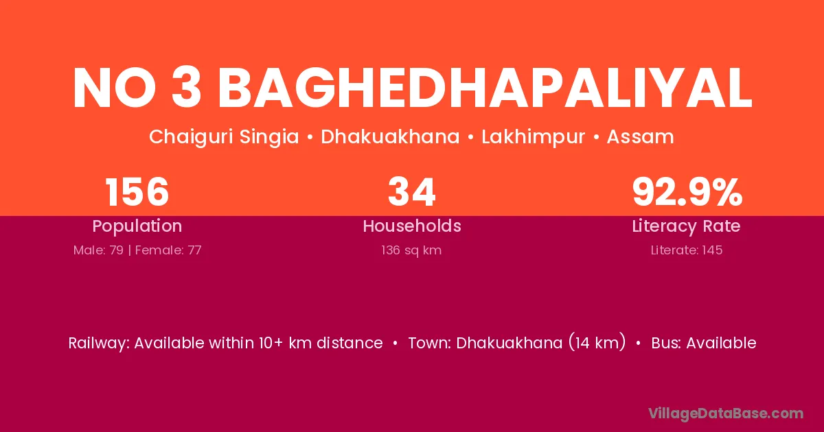 Dhakuakhana (14 km) is the nearest town to No 3 Baghedhapaliyal village for major economic activities and is located approximately 14 km away.