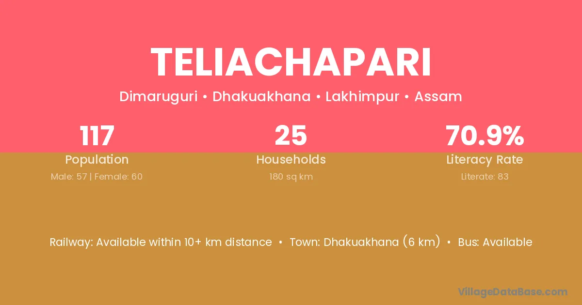 Dhakuakhana (6 km) is the nearest town to Teliachapari village for major economic activities and is located approximately 6 km away.