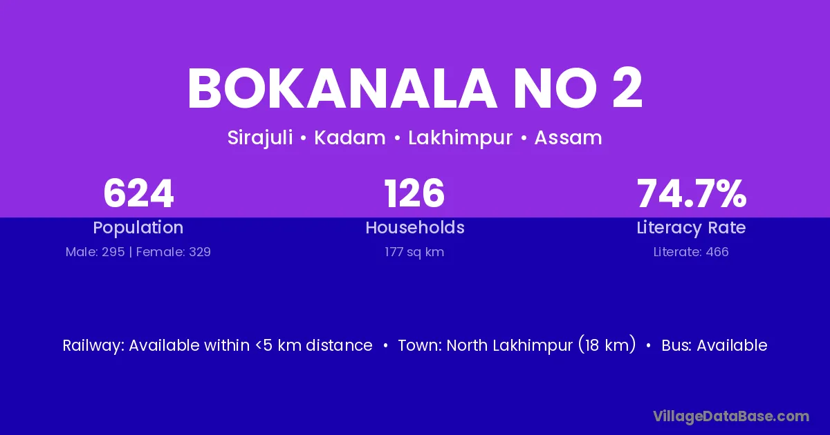 North Lakhimpur (18 km) is the nearest town to Bokanala No 2 village for major economic activities and is located approximately 18 km away.
