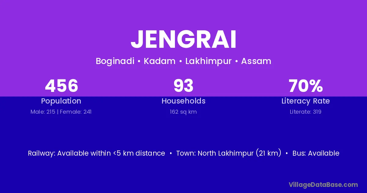 Jengrai village has a total population of 456 people, of which 215 are males and 241 are females.