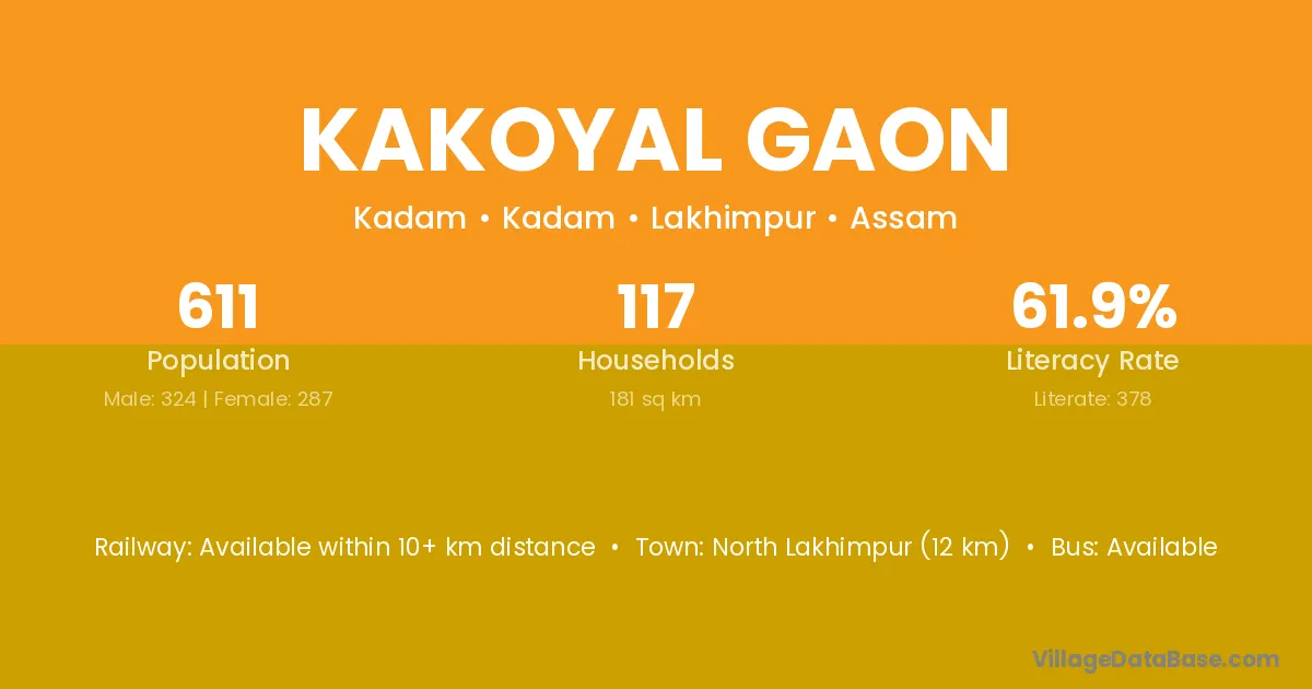 Kakoyal Gaon village has a total population of 611 people, of which 324 are males and 287 are females.