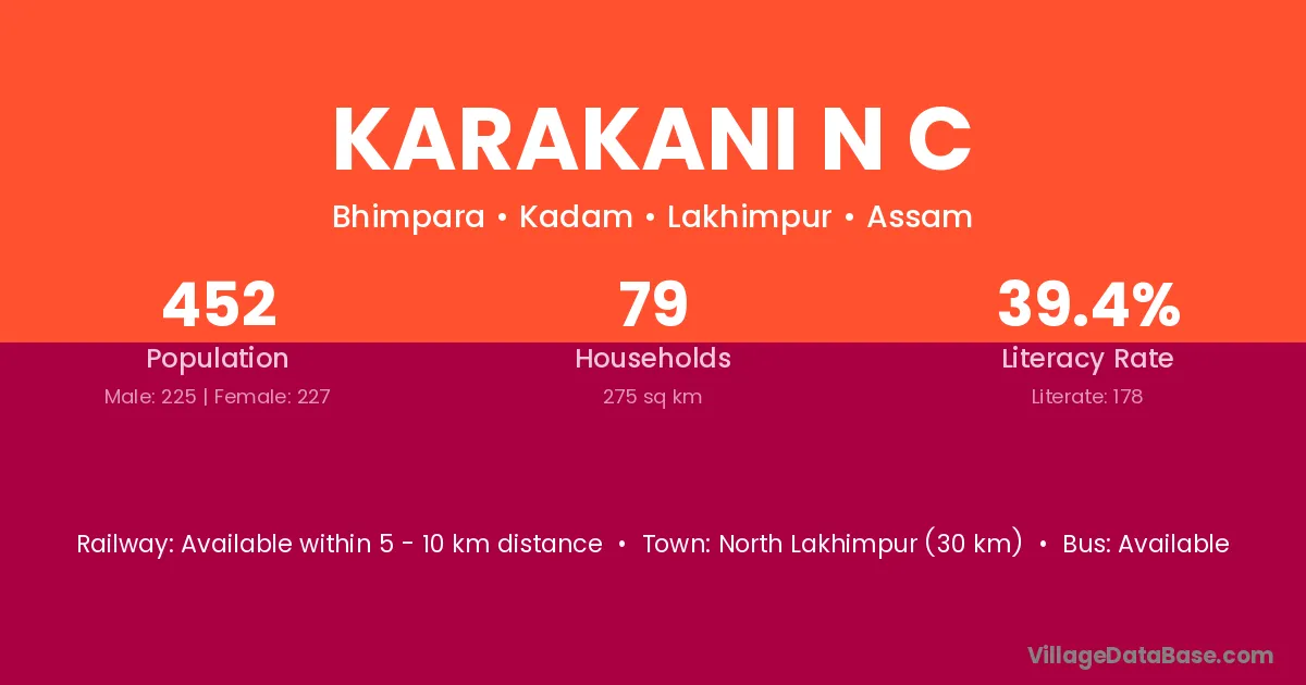 North Lakhimpur (30 km) is the nearest town to Karakani N C village for major economic activities and is located approximately 30 km away.