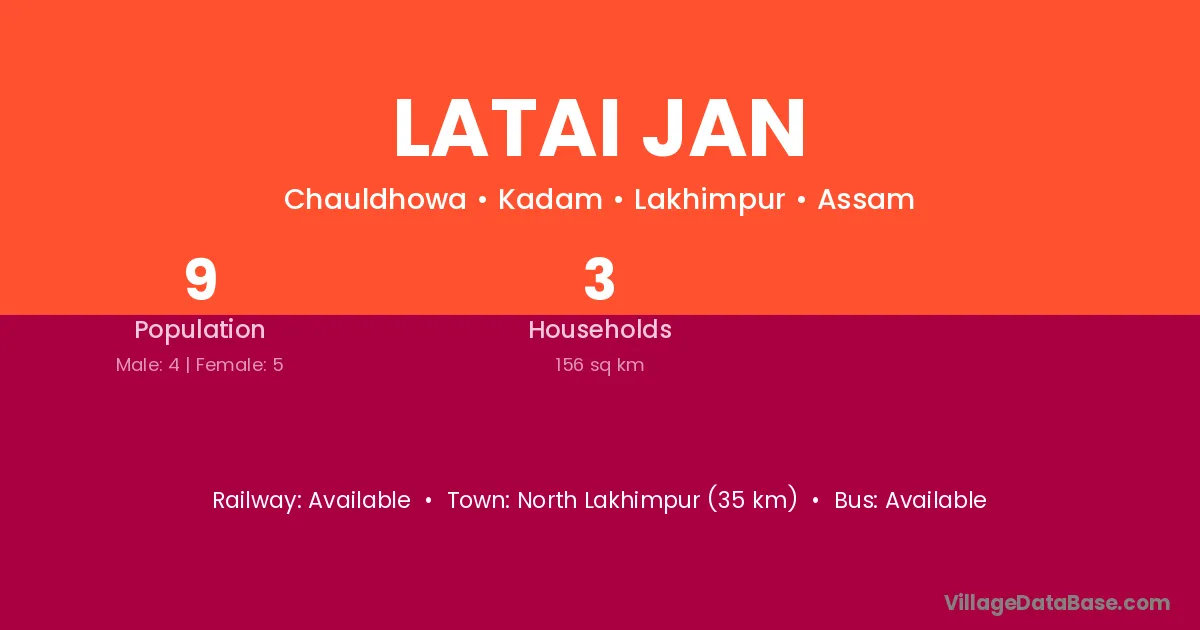 North Lakhimpur (35 km) is the nearest town to Latai Jan village for major economic activities and is located approximately 35 km away.