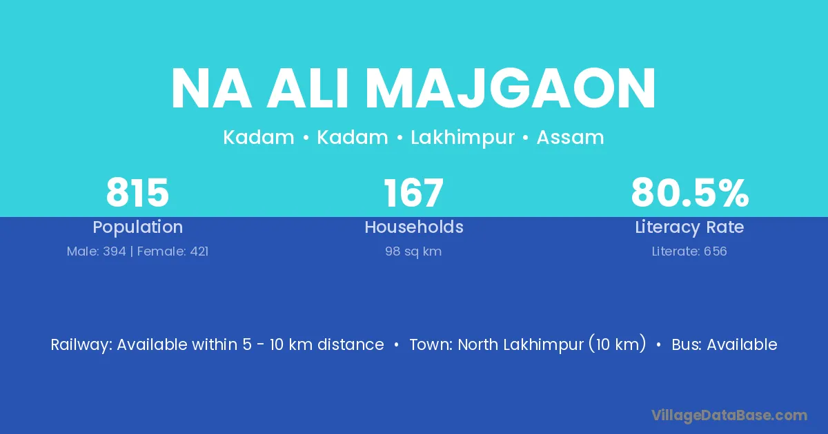 North Lakhimpur (10 km) is the nearest town to Na Ali Majgaon village for major economic activities and is located approximately 10 km away.