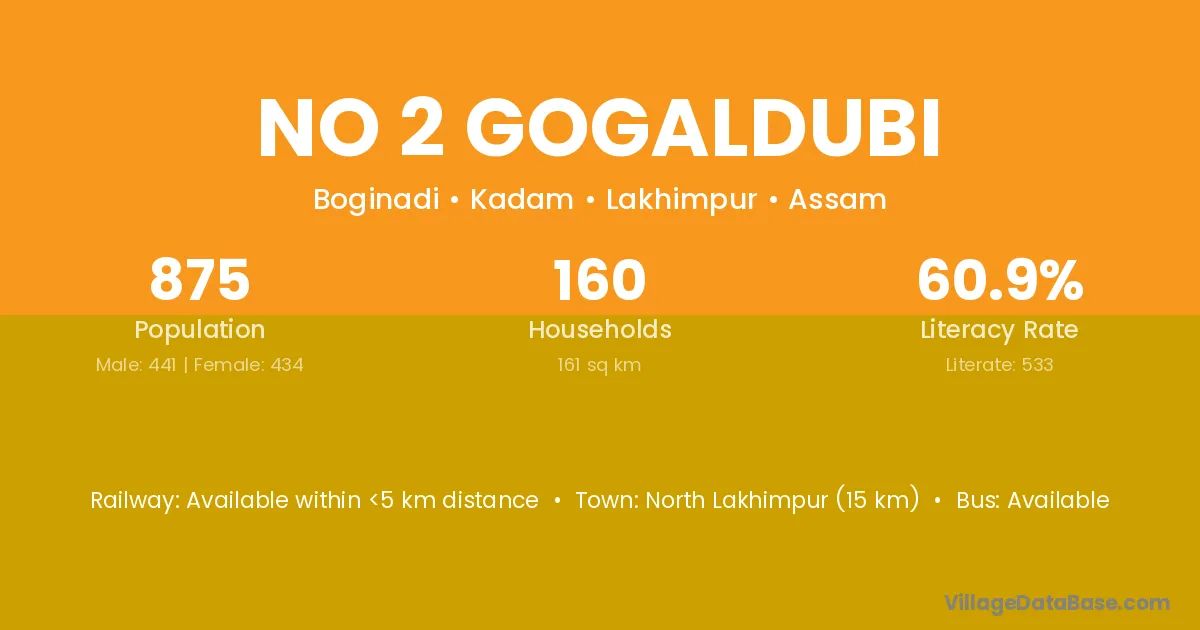 No 2 Gogaldubi village has a total population of 875 people, of which 441 are males and 434 are females.