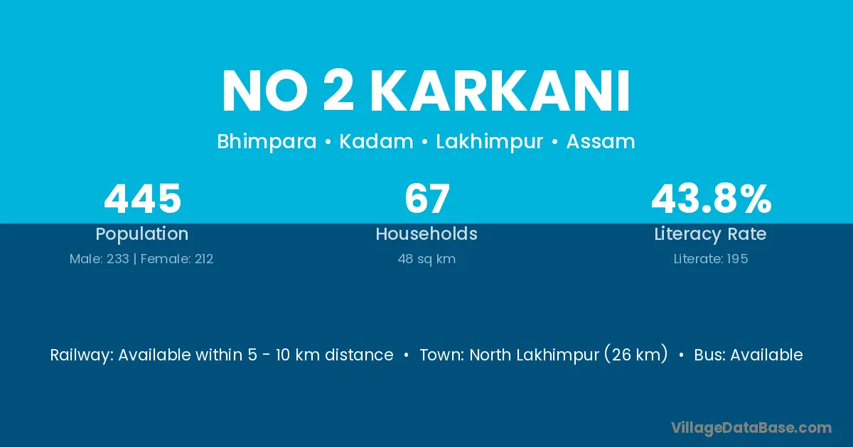 North Lakhimpur (26 km) is the nearest town to No 2 Karkani village for major economic activities and is located approximately 26 km away.