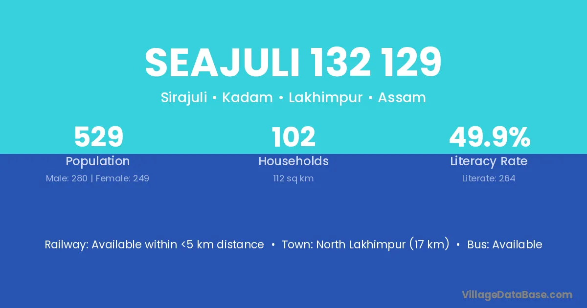 North Lakhimpur (17 km) is the nearest town to Seajuli 132 129 village for major economic activities and is located approximately 17 km away.