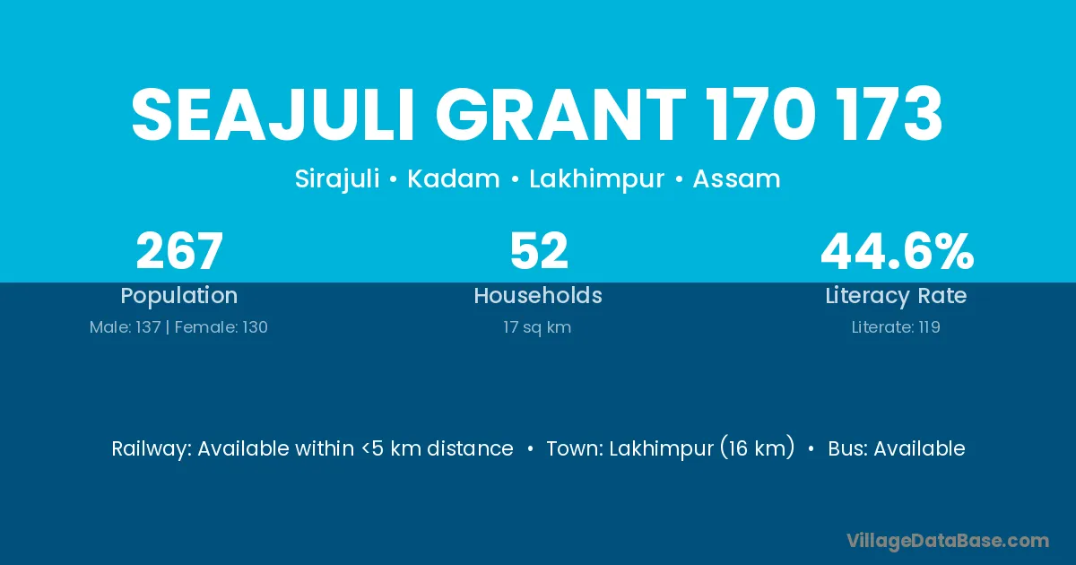 Lakhimpur (16 km) is the nearest town to Seajuli Grant 170 173 village for major economic activities and is located approximately 16 km away.