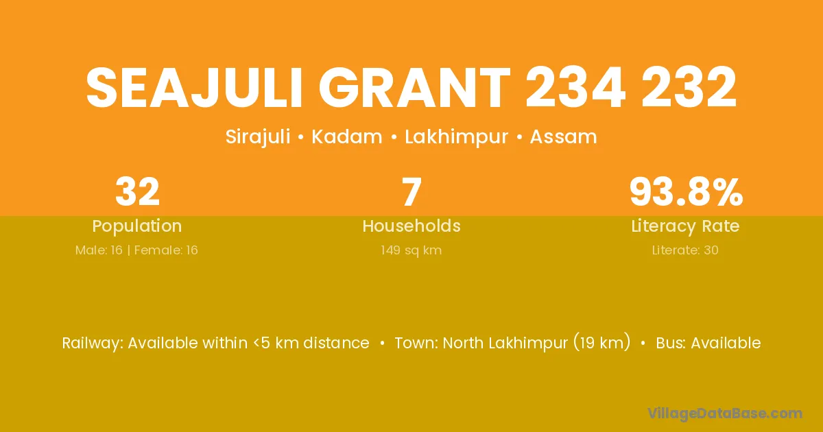 North Lakhimpur (19 km) is the nearest town to Seajuli Grant 234 232 village for major economic activities and is located approximately 19 km away.