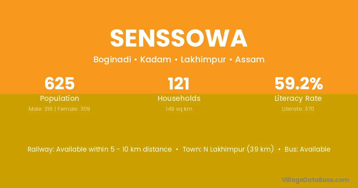 N Lakhimpur (39 km) is the nearest town to Senssowa village for major economic activities and is located approximately 39 km away.
