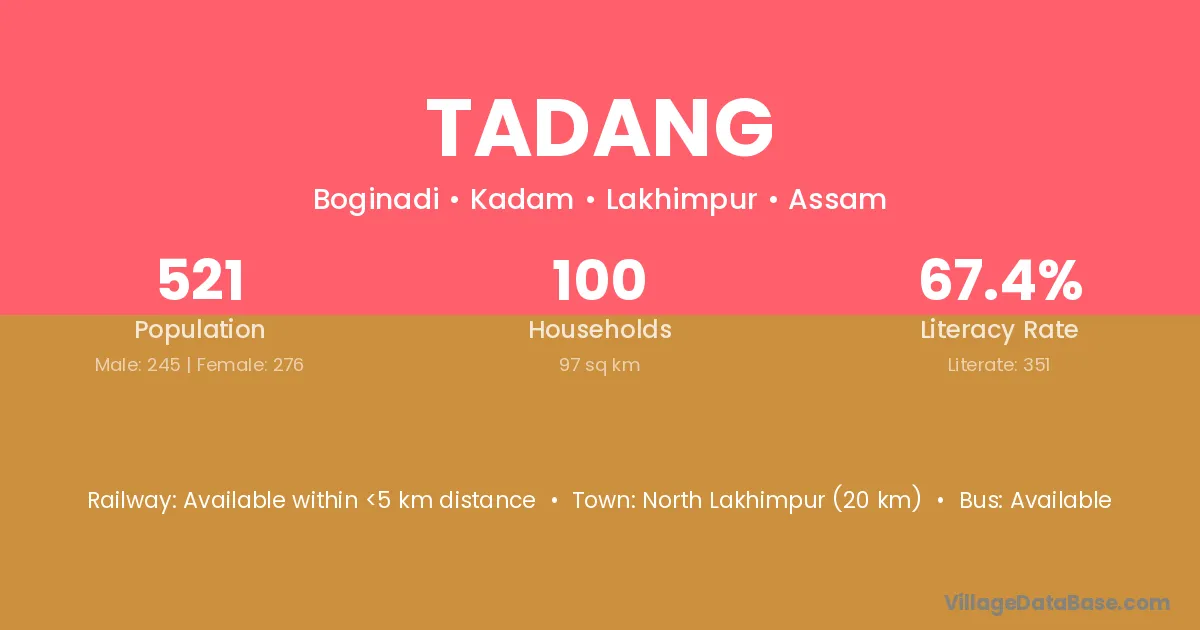 North Lakhimpur (20 km) is the nearest town to Tadang village for major economic activities and is located approximately 20 km away.