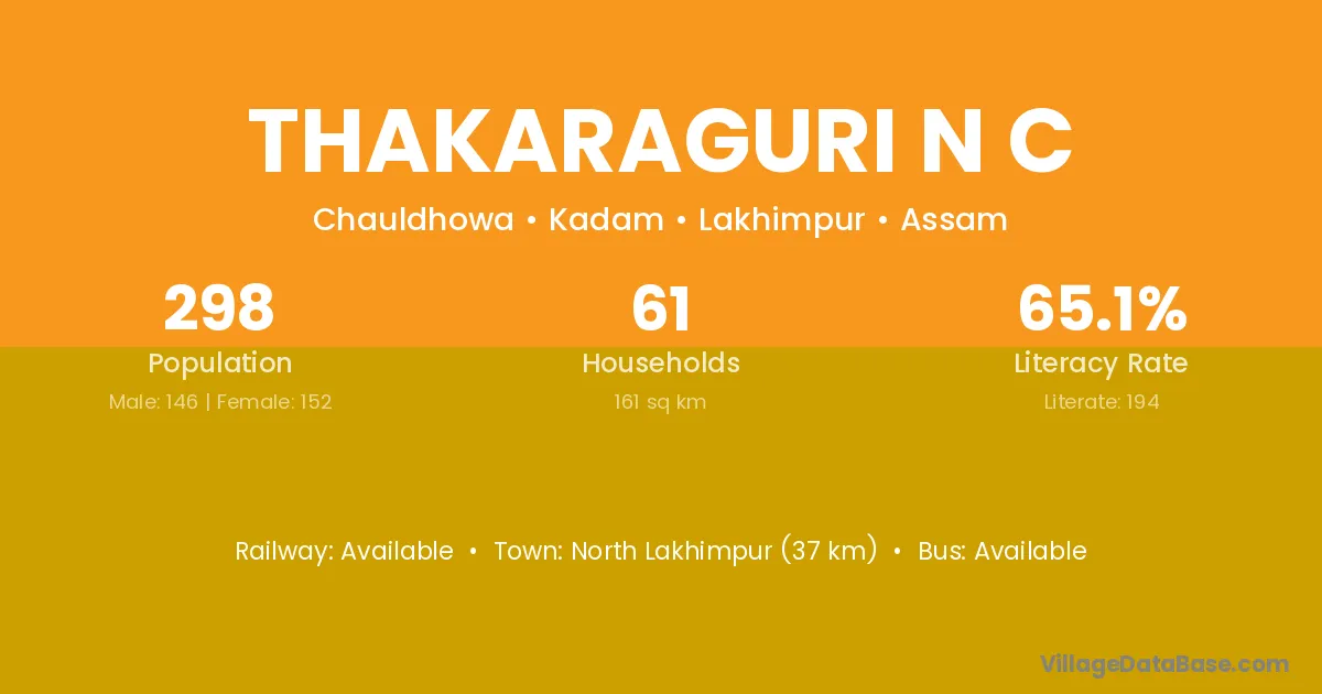 North Lakhimpur (37 km) is the nearest town to Thakaraguri N C village for major economic activities and is located approximately 37 km away.