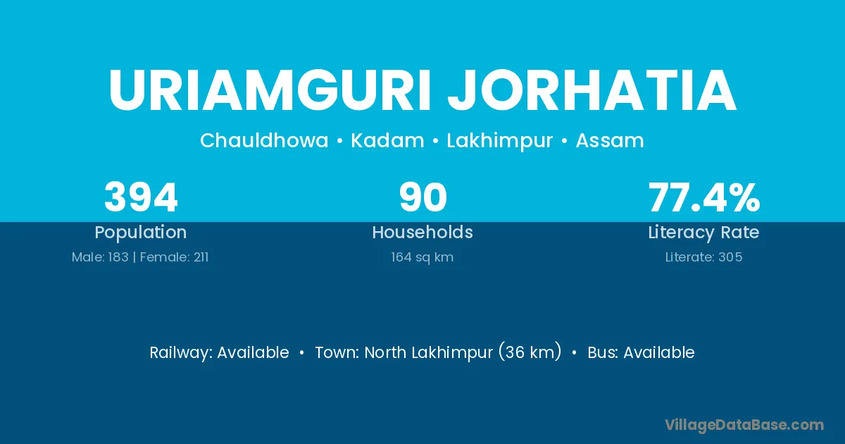 Uriamguri Jorhatia village has a total population of 394 people, of which 183 are males and 211 are females.