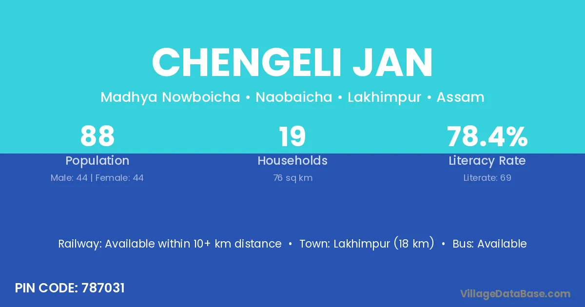 Lakhimpur (18 km) is the nearest town to Chengeli Jan village for major economic activities and is located approximately 18 km away.